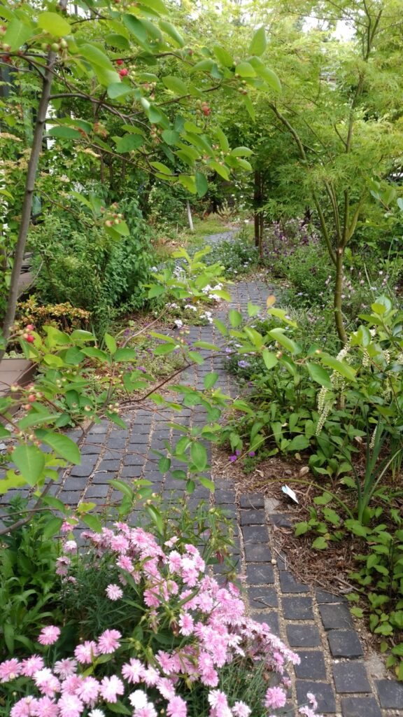 南側は北側と同じ石で通路を作成。曲線を描くことで奥行きを出しました。