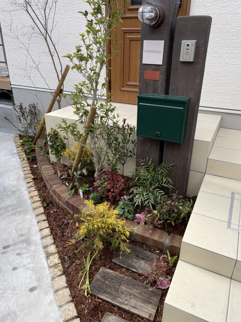 ■ 茨木市 | 機能門柱・植栽 機能門柱と植栽を中心にした門まわり外構の施工を行いました。表札・ポスト・インターホン・照明をまとめた機能門柱を設置し、足元にはレンガで縁取った植栽スペースをレイアウト。玄関まわりが引き締ま […]